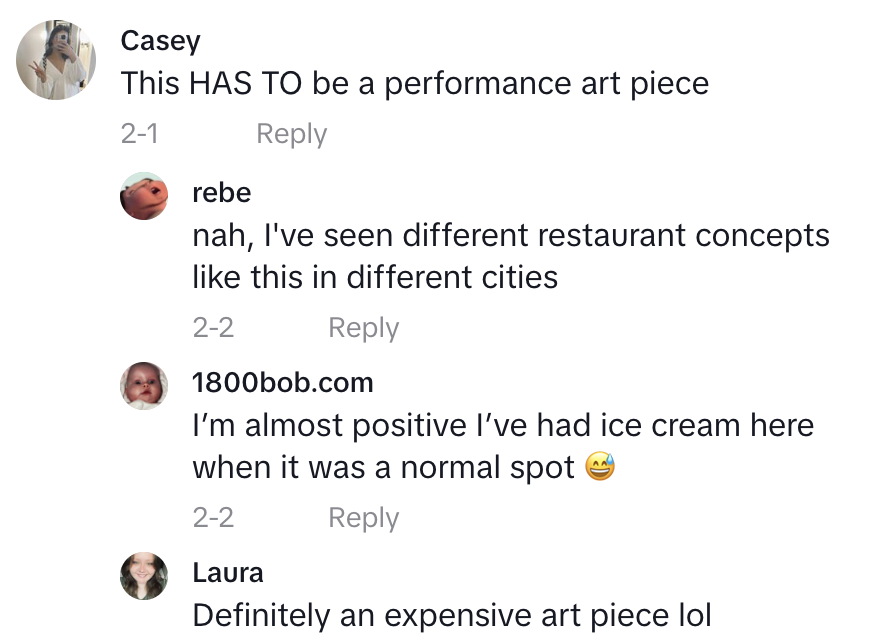 She added, “This ice cream is cheaper than therapy. I feel like I’m in a Black Mirror episode. This is wild. Can we like put chairs in here or something? I hear people around there. I’m so serious, though they have no reason to know my name.”