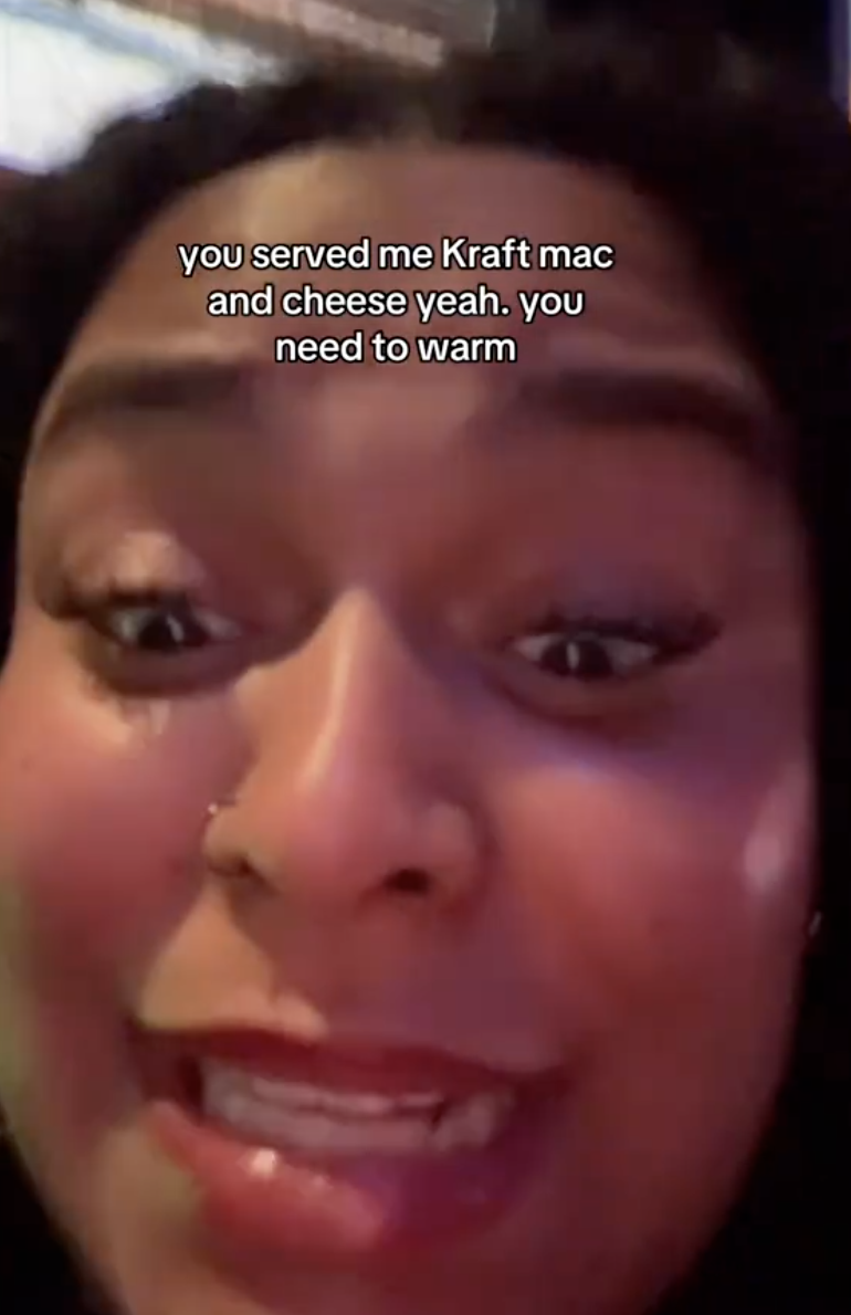 She said to her waiter, “You served me Kraft mac and cheese. You need to warn Black people when they order a side of mac and cheese.”