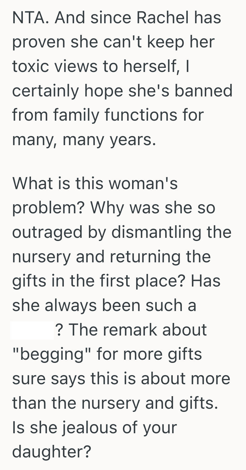 Rachel made a HUGE deal out of my daughter being “hysterical” and constantly, loudly talked about how “ridiculous” it was to take apart the nursery.