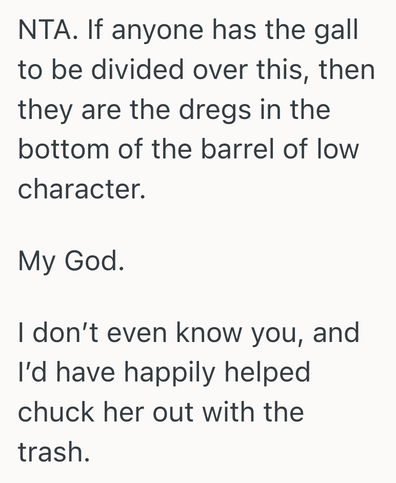 Now the family is divided over whether I should’ve yelled at her to get out and thrown her present.