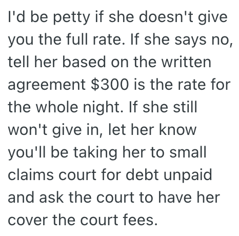But when it came time for payment, she was shorted $50, with the mom claiming the early departure justified the deduction.