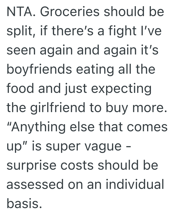 He suggested he’d pay for the “fixed” expenses like electricity and Wi-Fi, and I’d cover groceries, cat food, and anything else that comes up.