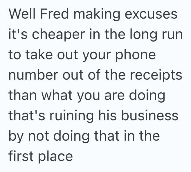 “You, Fred have decided that it’s too inconvenient to cross my home phone number off of your receipts, so you’re just going to keep giving it out?”