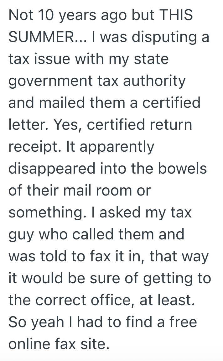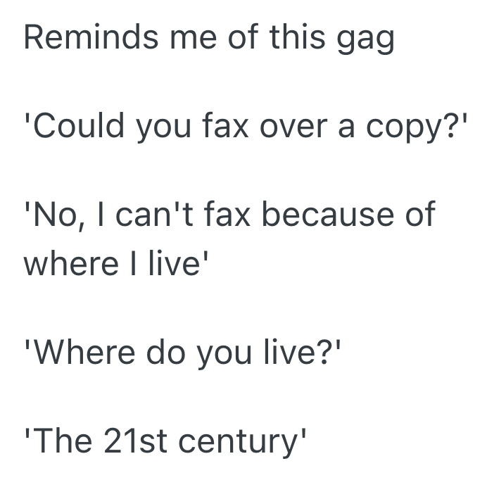 Oh, wait. This story, this story is the last time I heard a story about faxing, and even when this story took place faxing was outdated.
