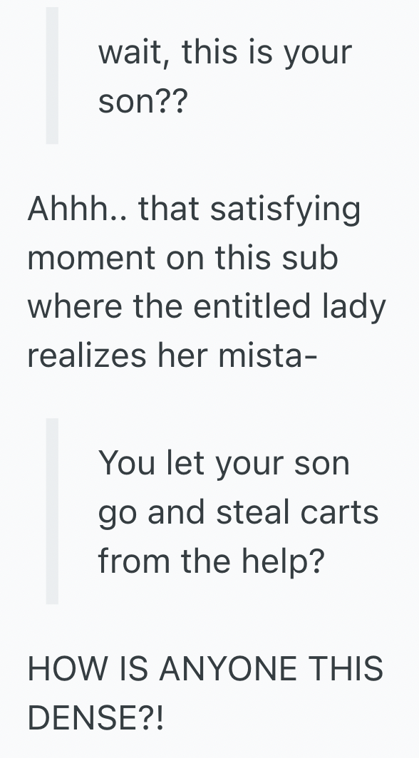 She interjected, “Wait, this is your son?? You let your son go and steal carts from the help?”