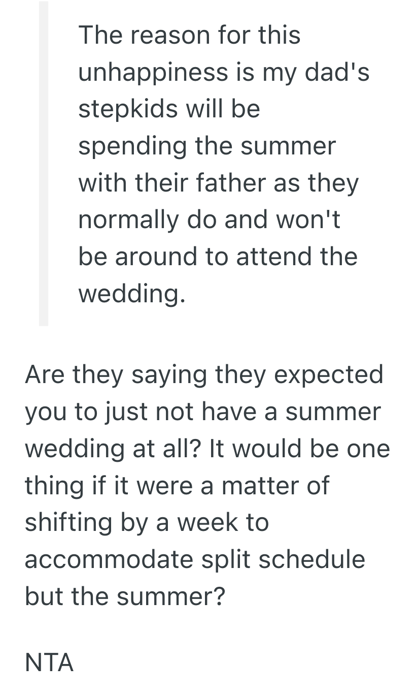 However, my dad’s stepkids being there is not a priority for my fiancée or me, so we didn’t plan around the custody schedule.