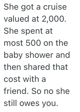 Her friend’s reply was, “I spent so much money on your baby shower I figured we would call it even.”