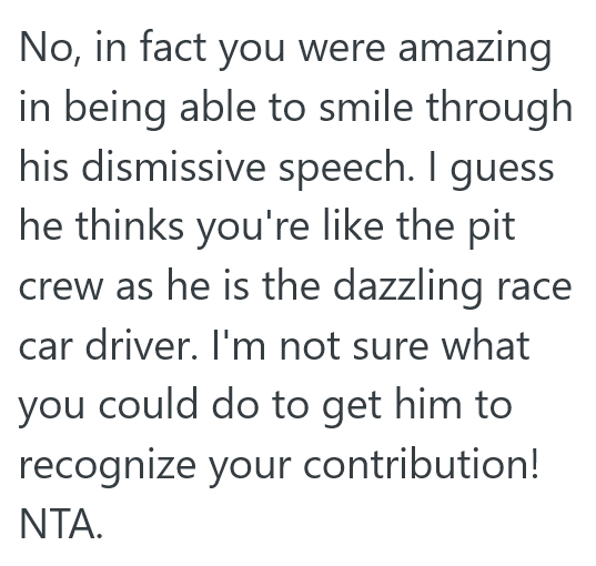 No mention of how I supported him emotionally, nothing about how I helped him through burnout or took on extra stuff to make his life easier.