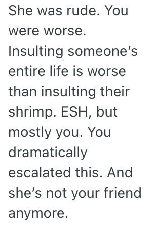I eventually got fed up and said something along the lines of, “Interesting take considering that I know you’ve never cooked shrimp ever in your life, and probably can’t afford to either. You don’t work, Ryan doesn’t have a real job….you guys come over here for free food and complain about it? Nah. I’m done.”