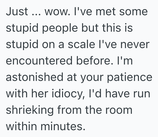 The surreal mix of entitlement and delusion in her statement left me dumbstruck and I decided I must be misinterpreting this somehow, because there was no way any grown adult who votes, drives, works, and has kids of her own is that stupid, not even her, so I just let her leave rather than risk offending her or embarrassing myself.
