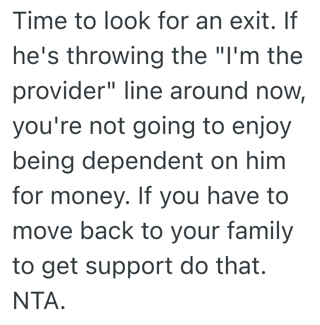 The issue came up when now my husband refuses to lift a finger because he’s the “provider”.