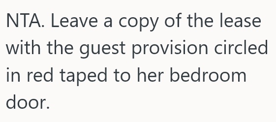 On top of all of this, our lease says that housing the same person for more than 3 nights in a 30 day period isn’t allowed, and there’s a $100 fee for every extra night they stay.