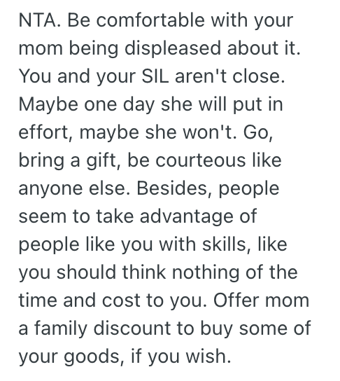 Now her mom wants her to make a dessert table for her sister-in-law’s baby shower, but she doesn’t want to.