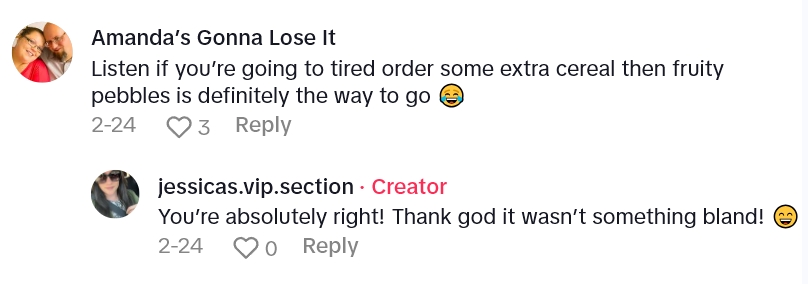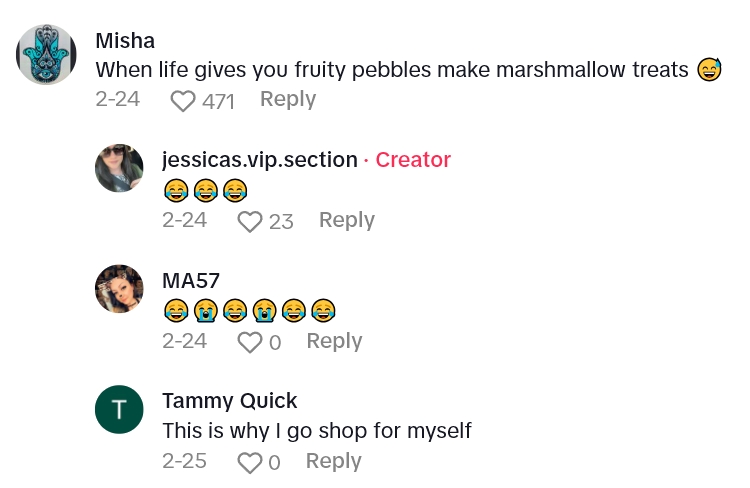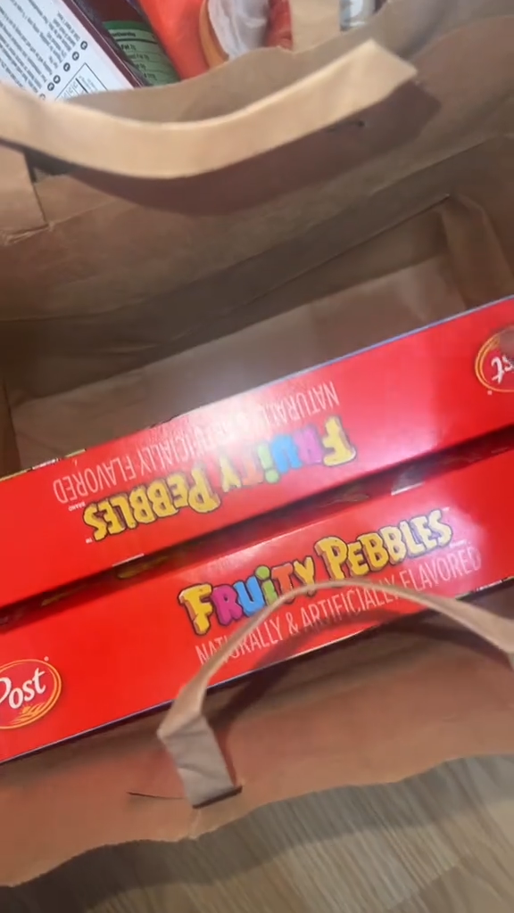 “So don’t do grocery shopping at one AM when you’re falling asleep. Because I looked back at my order. I did buy five boxes of Fruity Pebbles. So it looks like we’re gonna have cereal for a while.”