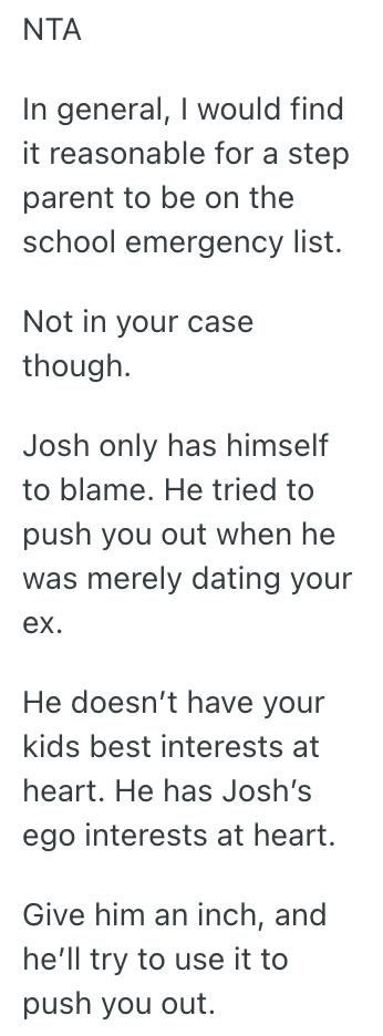 Josh was never added to the emergency contact list (school requires the consent of both parents) so our kids have my ex, then me, then my mom and dad and then her mom and dad as their emergency contacts.