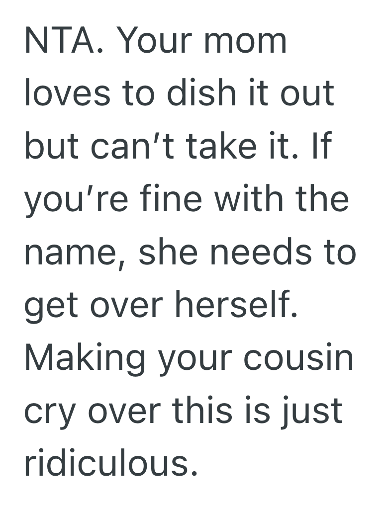 When a cousin chose to give her baby girl a traditionally male name, one teen found himself caught in the crossfire of his overly critical mother’s tirade.