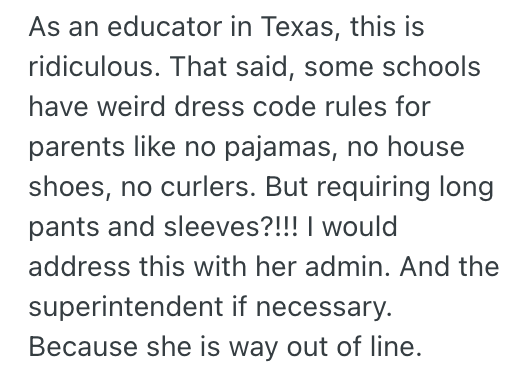 That teacher is being completely unreasonable. Schools don’t have a dress code for parents picking up and dropping off their kids!