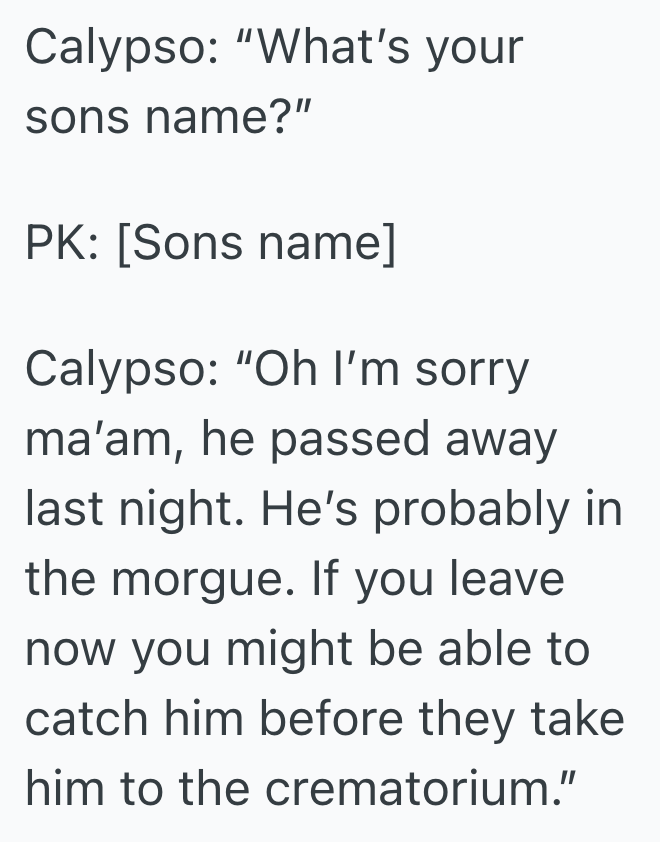 PK: I understand, but this woman isn’t letting me see my son and he needs his mommy right now. She needs to be dealt with for being such a terrible, irresponsible nurse.