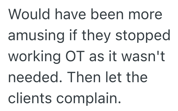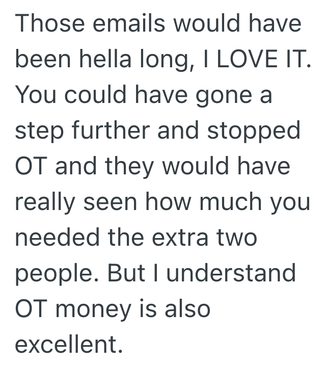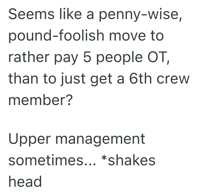 So the crew was down to 4 and boss’s boss decided that it was the perfect time to not only prove that the OT was unjustified, but that they didn’t actually need to replace the 5th crew member.