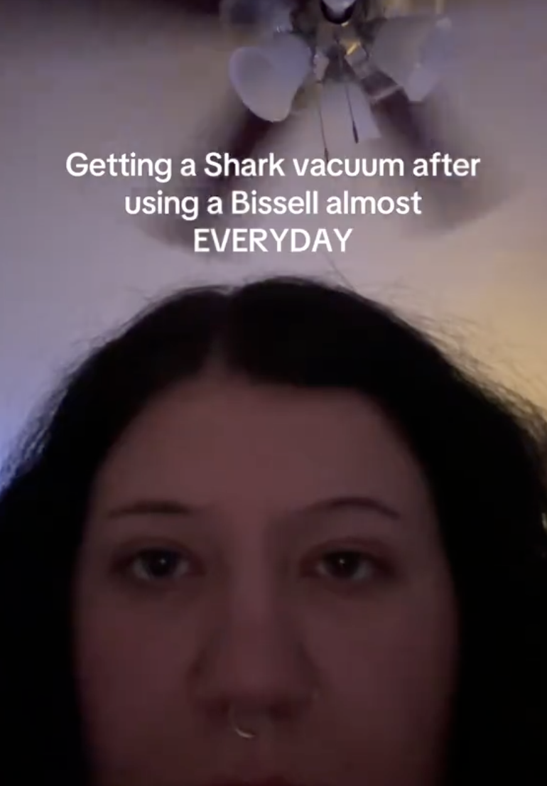 Neven’s text overlay reads, “Getting a Shark vacuum after using a Bissell almost EVERY DAY.”