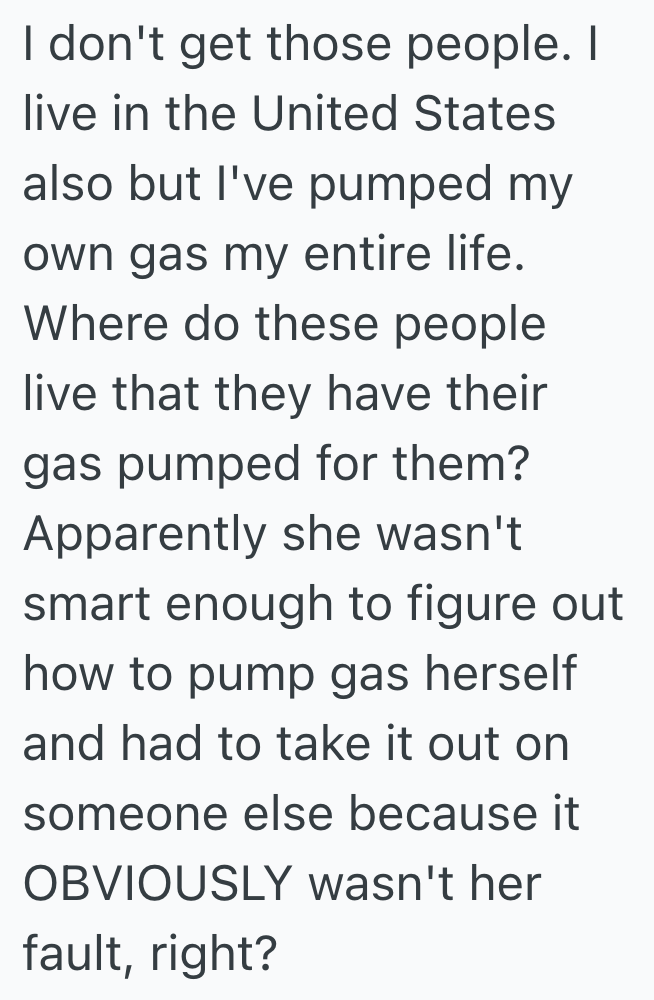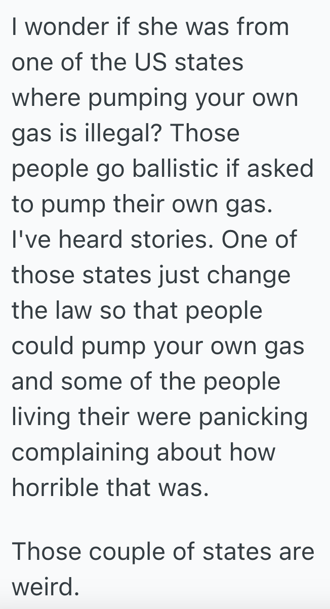 The woman in today’s story seems to assume that’s how gas stations work, but every gas station I’ve ever seen has been self service where you pump the gas yourself.
