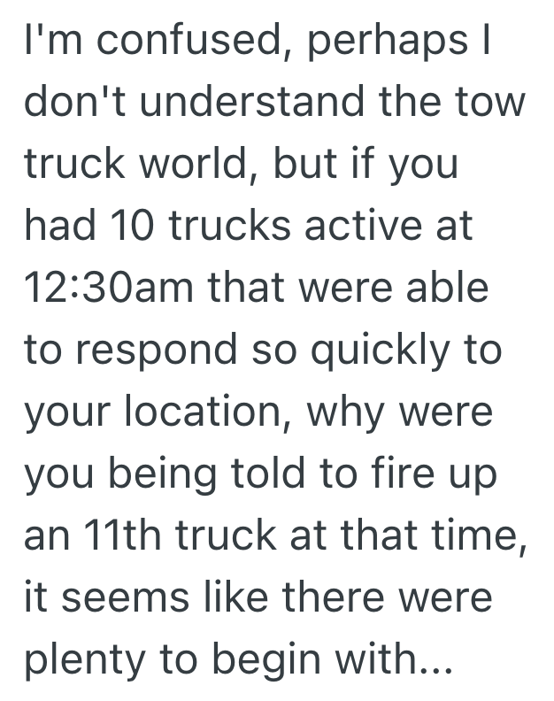 Well I get a call from my boss asking if I can go warm-up the Rotator and the light duty flatbed (tow trucks).