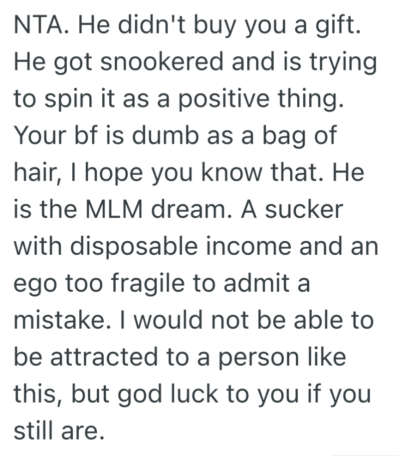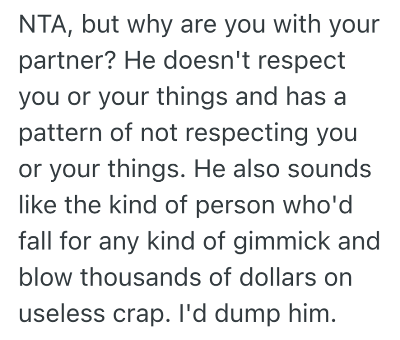 He has a history of buying me things after I explicitly say no, then getting upset and calling me ungrateful when I don’t accept them.