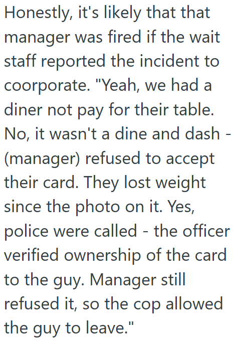 She comes back a few minutes later, tells him she can’t charge the meal to that card because he doesn’t look like the picture on the credit card.