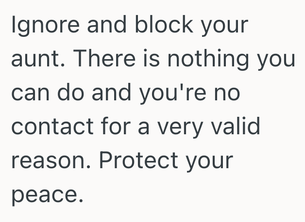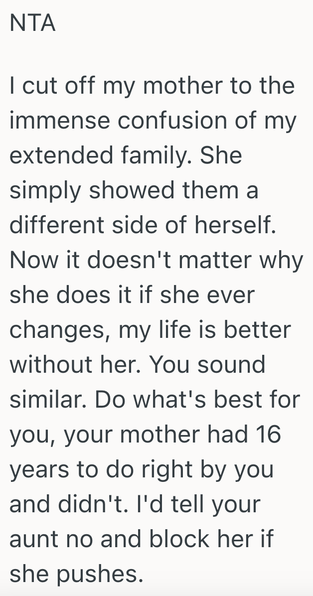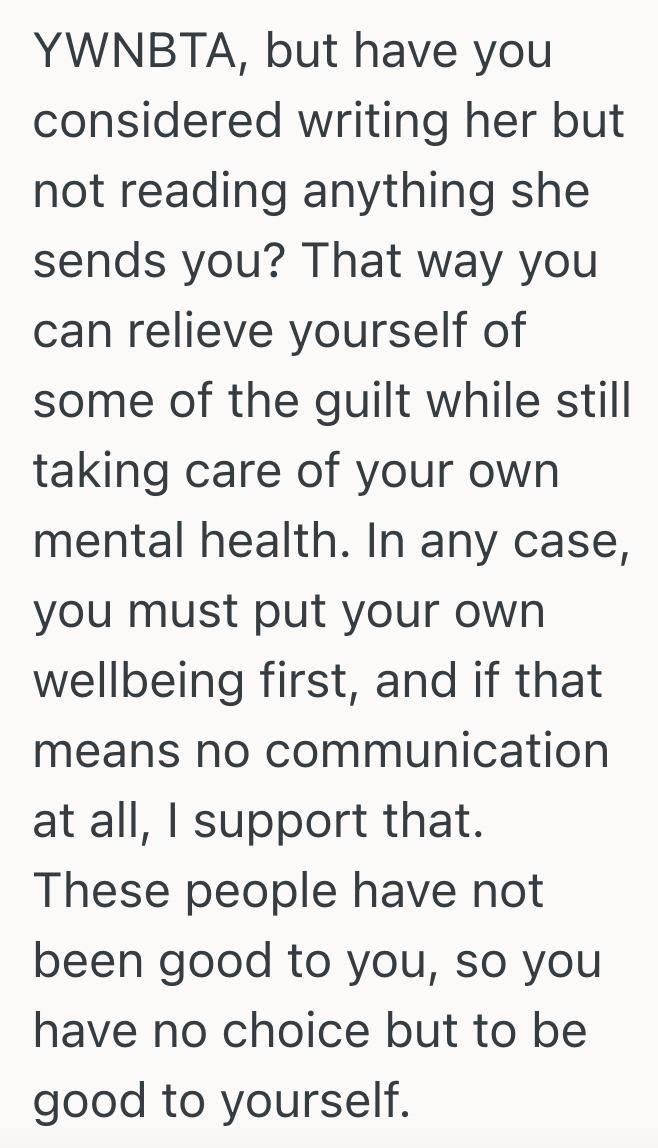 That’s a tough situation. She needs to prioritize her own mental health, but I understand wanting to reach out to her mother as well. Her aunt is totally guilt tripping her though.