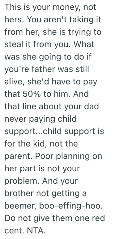 Quite recently my brother (17) told me that our mother and his father bought a house, they are going to sell the apartment and even tho most of the money from selling the place will go to renovating the house, they will buy him a car (BMW!!!) for his 18th birthday!