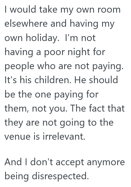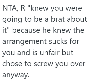 But now the room is on R’s credit card and he told me the sleeping arrangements, B gets her own bed bc she doesn’t like sharing a bed, C and D get the other bed, A and R will sleep on the floor with the couch cushions and pillows, and said I can sleep on the pullout.