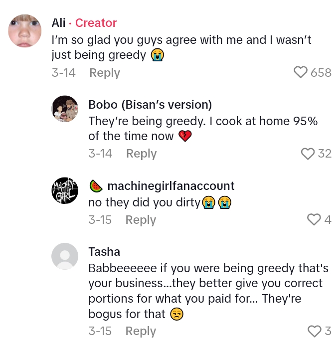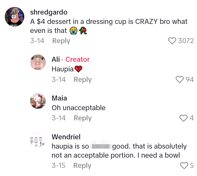 “This is a 4 dollar dessert I paid extra for,” she says, holding up a barely larger cup of yogurt, maybe?