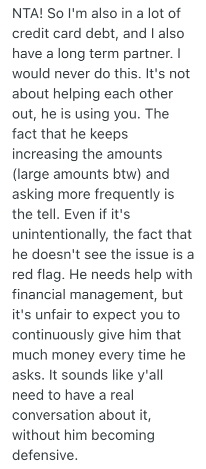 In the past six months, I have Zelle’d him around $700 whenever he asks for extra money for food after he dumps his paycheck into paying off his card.