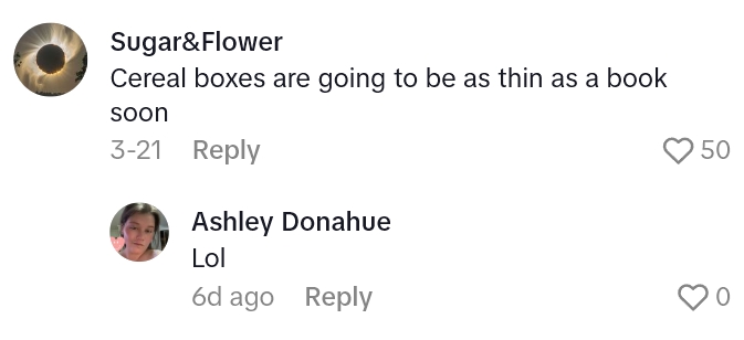 “Oh, no. If you’re a cliff bar person, they are no longer coming in the 12 packs anymore. They’ve gone down to 10. Same price though. Of course.”