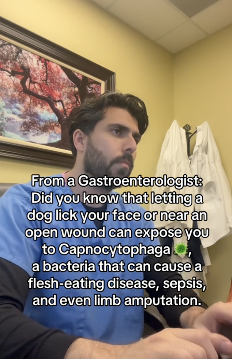 The text overlay on the video reads, “From a gastroenterologist: Did you know that letting a dog lick your face or near an open wound can expose you to Capnocytophaga, a bacteria that can cause a flesh-eating disease, sepsis, and even limb amputation?”