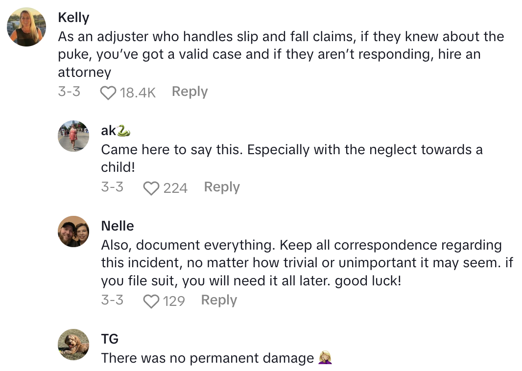 She said, “So we have a concussed 3-year-old. Sill have not heard a peep back. I can be a pretty understanding person, but my God. Please reach out. This is absolutely ridiculous.”