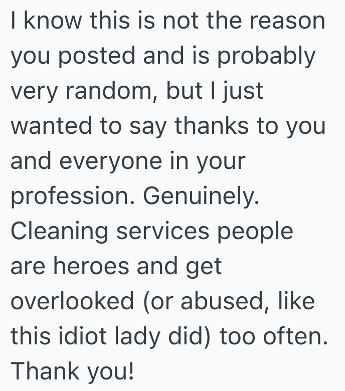 But as I’m beginning to clean, with my cart and my janitorial uniform, a woman comes in with two kids, 5 and 7ish.