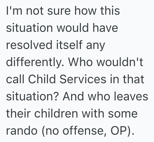 The cops and social worker were lecturing them and the woman was like “I left them with a childcare worker in the drop off area!”