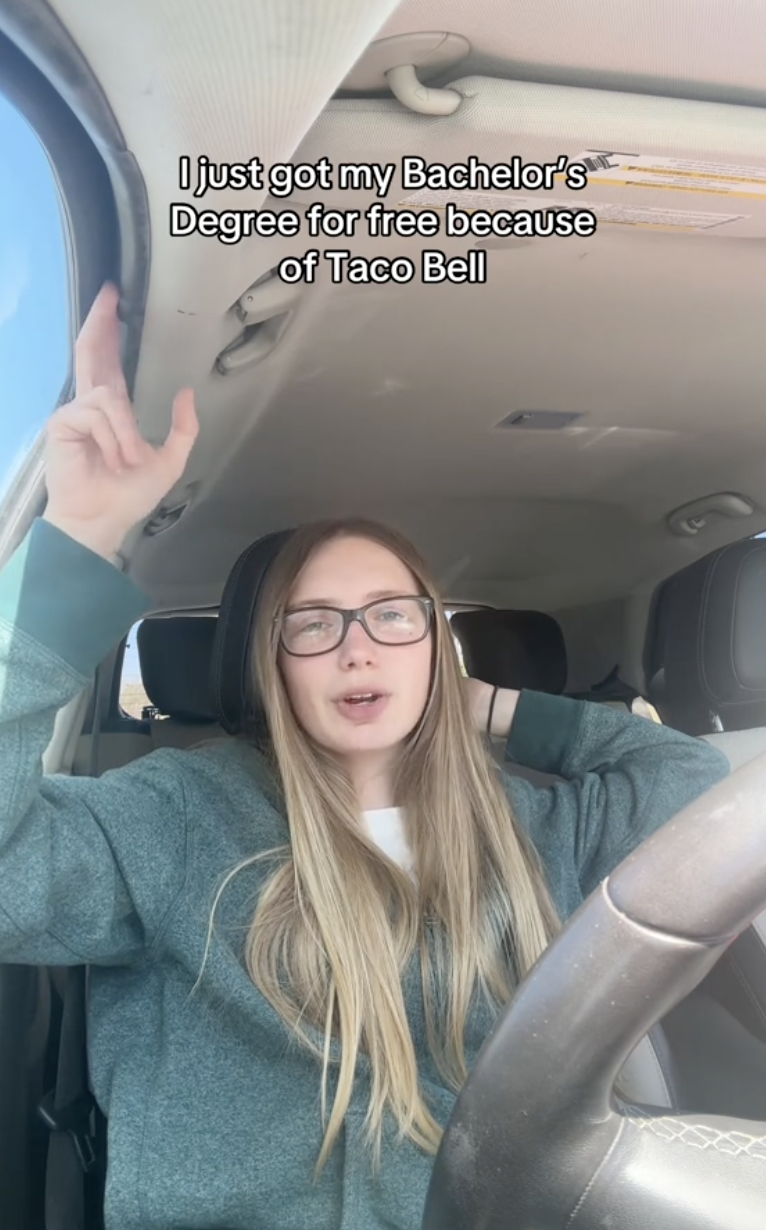 Crimsyn told viewers, “I am graduating college in less than a month, completely debt-free because of Taco Bell.”