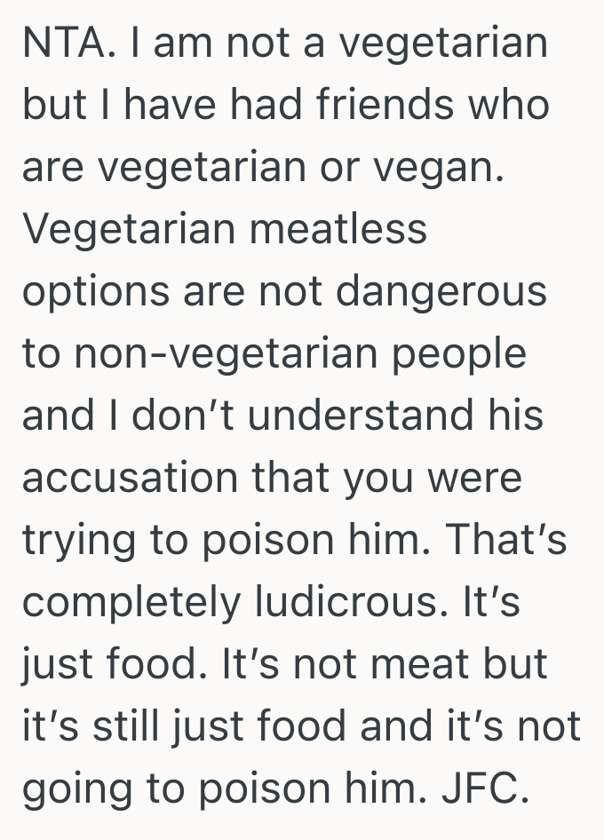 I try to defend myself by saying I wasn’t the one that gave him the fake meat, and he grabbed himself (which is 100% true)