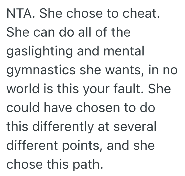 I told her cheating is a choice, not an accident. If she was unhappy, she could have talked to me instead of sleeping with someone else.