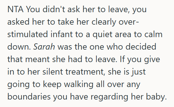 I eventually pulled Sarah aside and asked her if she could maybe step outside with the baby or take a break in the other room until the baby calmed down.