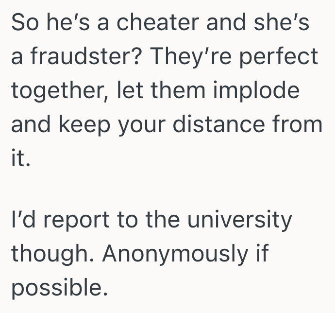 Her boyfriend (who isn’t the best person either) had cheated on her before her and I met and she told me with pride that she had hacked into his student finance account and cancelled his application.