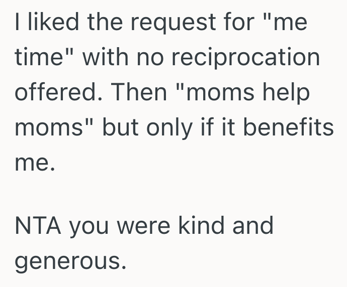 My husband and kids stand by my decision, but some of the other moms think I should have been more accommodating, saying I’m selfish, that moms help moms and I’ll never know when I might need help.