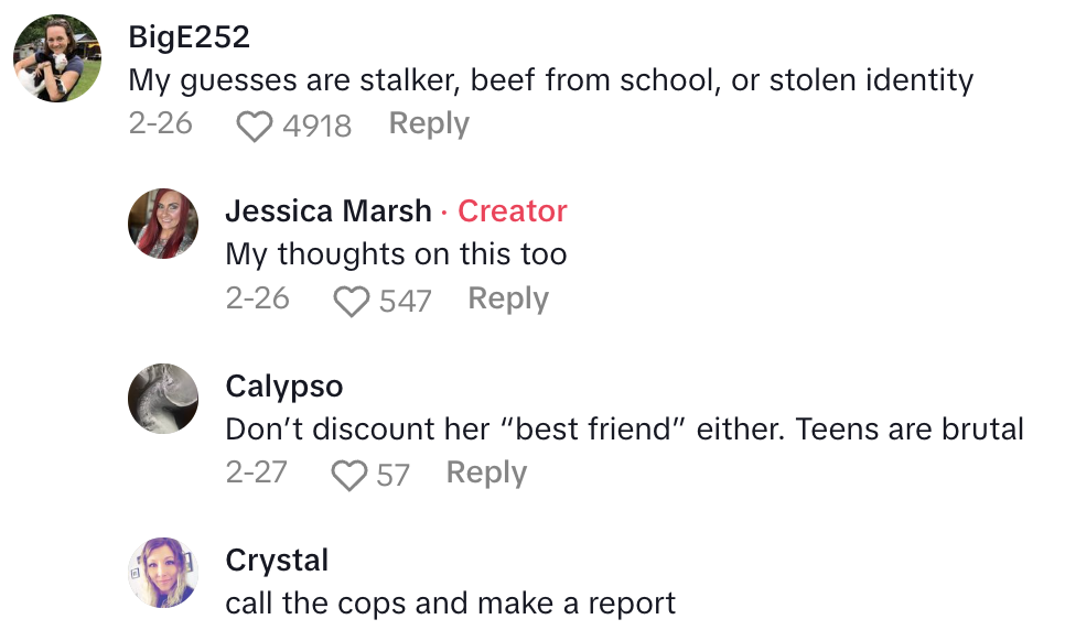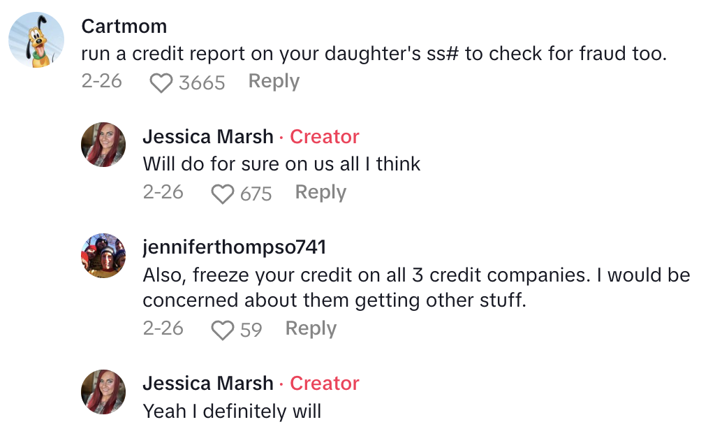 In a follow-up video, Jess said that she’s been the victim of fraud before, and she’s now looking at these incidents as identity theft.