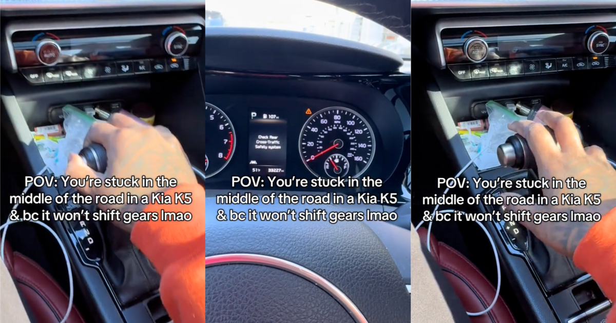 The text overlay on the video reads, “POV: You’re stuck in the middle of the road in a Kia K5 & bc it won’t shift gears.”
