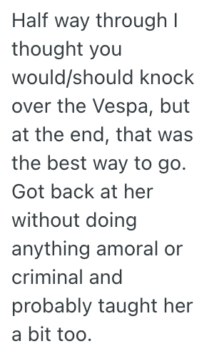 My girlfriend pulls a little ahead of the car in front of the spot, turns on her indicator, and begins backing into parking spot when this little white Vespa driving behind us whips into the spot.