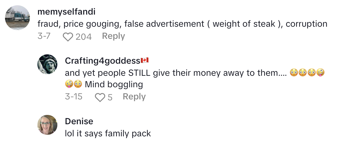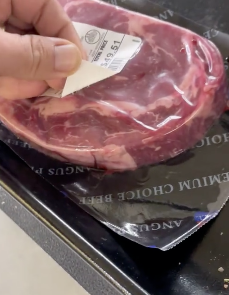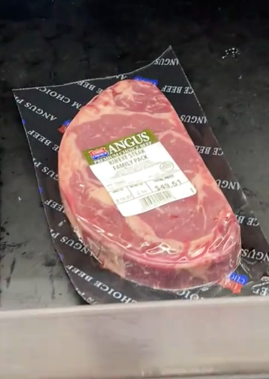 The man showed viewers a ribeye steak family pack and he said, “I see this thing with the most ridiculous price. And I know for a fact that these are not three pounds.”