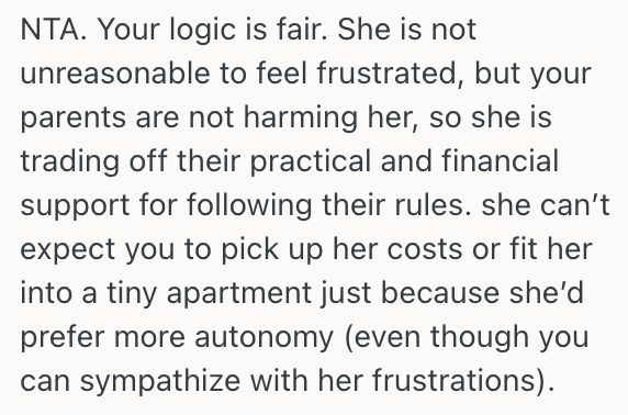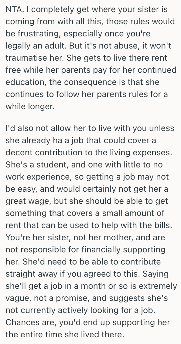 My parents don’t abuse or mistreat her, she doesn’t have to pay rent, and they are paying for her higher education.