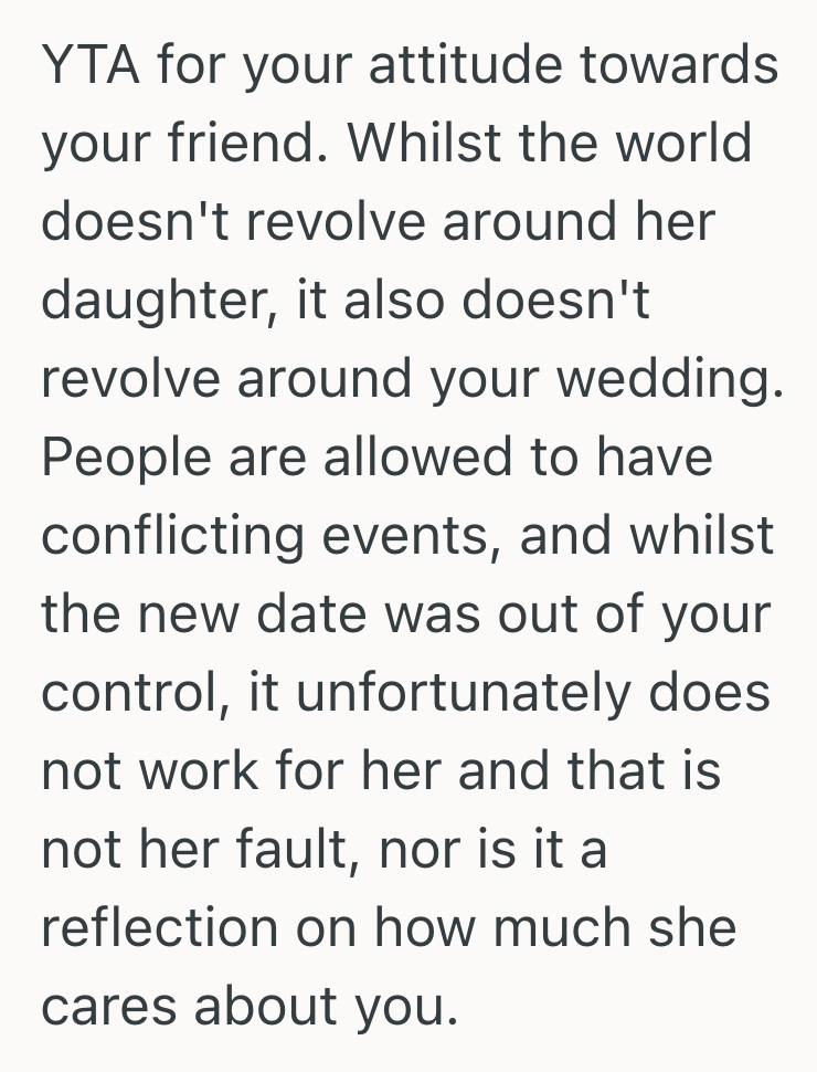 This commenter thinks this bride-to-be is being too harsh on her friend.
